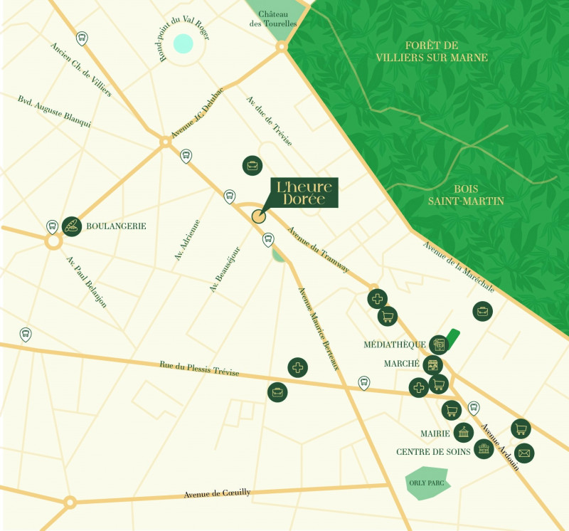 Les écoles maternelles et primaires, le centre de santé et les équipements de loisirs tels que la médiathèque sont également faciles d’accès. La proximité du Bois Saint-Martin est propice aux promenades en famille, à pied ou à vélo, au fil de ses allées boisées.