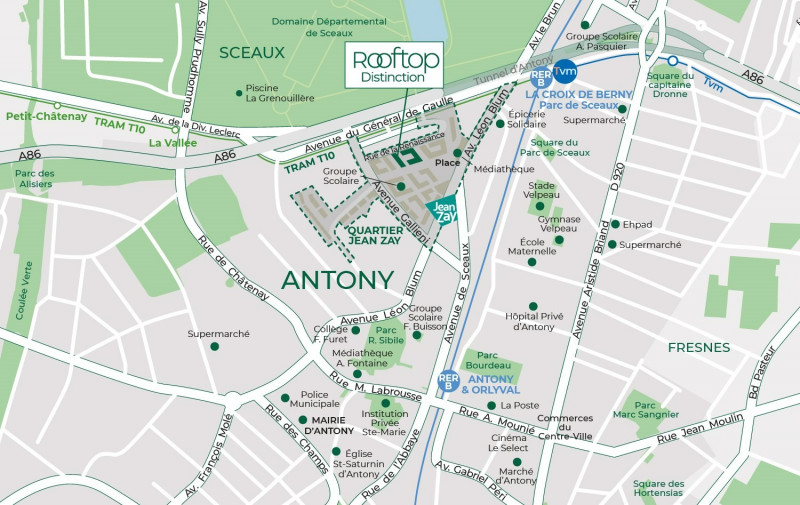 À seulement 6,5 km de Paris, tout près du parc de Sceaux et à un pas du centre historique d’Antony, le quartier Jean Zay bénéficie d’un emplacement idéal. Ce nouvel espace de vie de 11 hectares se distingue par son engagement environnemental et inclut des résidences neuves, des logements pour étudiants, des commerces, des services et une école.