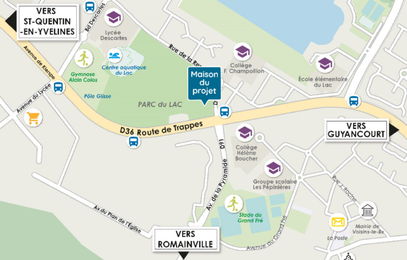 9 lignes de bus desservent l’écoquartier Parc du Lac. Elles permettent de rejoindre les gares de Saint-Quentin-en-Yvelines et de Versailles.